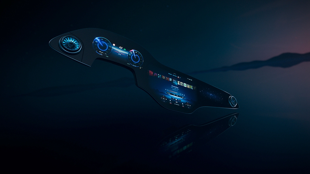 MBUX超联屏采用了三涂层工艺,通过极薄的中间涂层实现质感更强的视觉效果。同时,整体式环境氛围照明系统在屏幕下方形成了一条光带,营造出一种富有立体感的效果,令显示屏仿若悬浮于中控台之上。