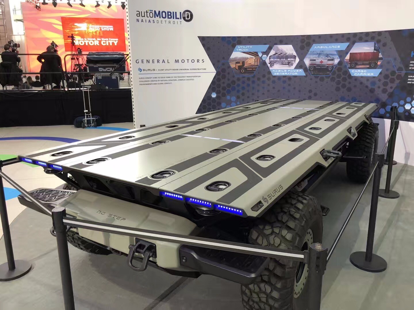无独有偶,通用汽车在专供做演讲的区域—autoMOBILITY D厅展出了一台多用途、全路况的电动商用车底盘,别看结构简介却充满未来科技感,电池包也居中放置台板下面;该底盘可改装成各种应用场景的大型车辆,战地或受灾区的医疗房车、货柜车、火箭发射车等。