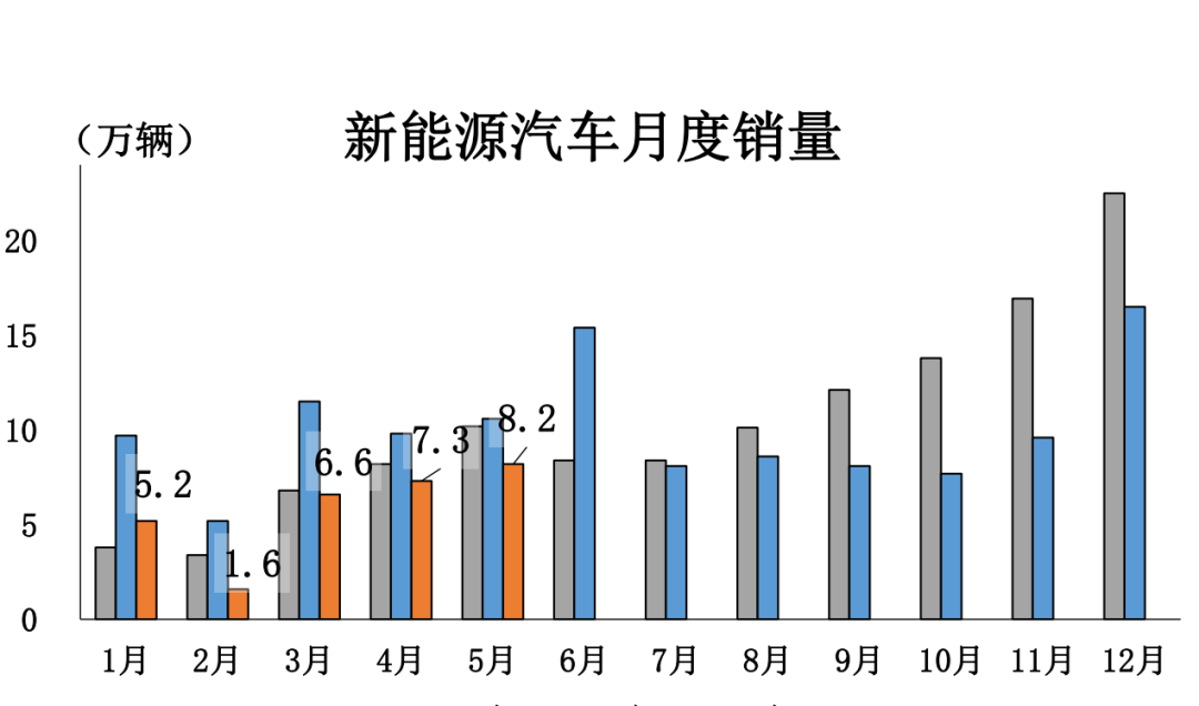 新能源方面,5月产销分别完成8.4万辆和8.2万辆,环比增长3.5%和12.2%,同比下降25.8%和23.5%。在新能源汽车主要品种中,与上月相比,纯电动汽车产销均呈增长,插电式混合动力汽车有所下降;与上年同期相比,插电式混合动力汽车产量增长依然明显,销量下降较快,纯电动汽车产销降幅仍然高于行业。