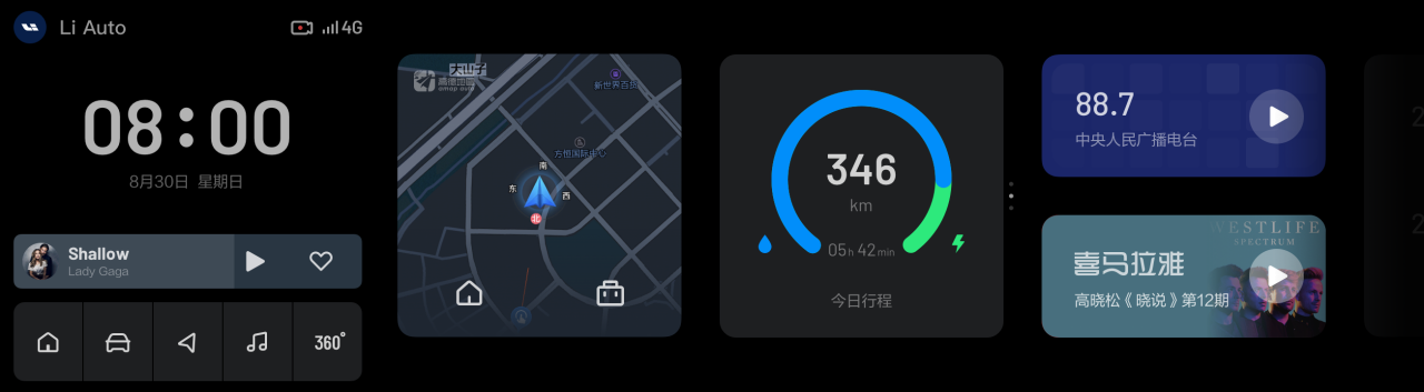 仪表屏进行了重新的设计,不仅添加了胎压、天气、后排状态等仪表信息卡片,还更新了地图卡片的设计,让整个仪表屏界面信息更丰富,视觉更美观,并且可以自由切换。