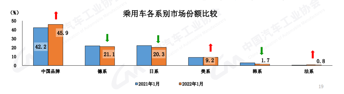 1月,中国品牌乘用车销量比上月有所下降,同比保持快速增长,且增速高于行业总体。当月共销售100.4万辆,环比下降11.7%,同比增长15.9%,占乘用车销售总量的45.9%,占有率比上月下降1.0个百分点,比上年同期提升3.7个百分点。在主要外国品牌中,与上月相比,德系品牌销量略有增长,日系和法系降幅略低,美系和韩系均呈较快下降;与上年同期相比,法系销量增速依然迅猛,德系和美系呈小幅增长,日系和韩系均呈下降,其中韩系品牌下降更为明显。