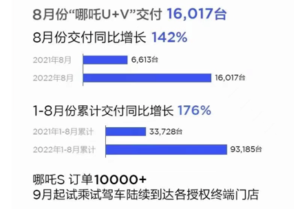 今年1-8月,哪吒汽车已累计交付93185台,同比增长176%。截止2022年8月,哪吒汽车品牌自成立以来,累计交付量189162台。