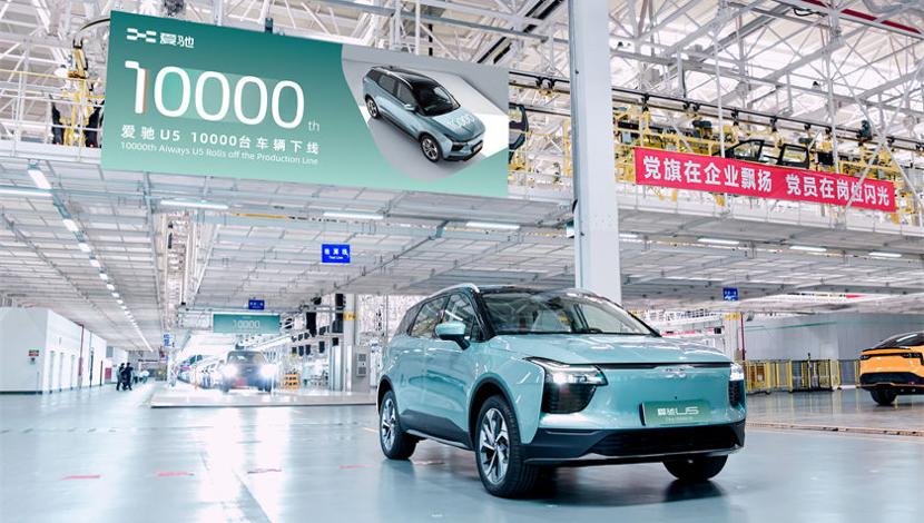11月3日,爱驰10000台整车在江西上饶智慧工厂下线。