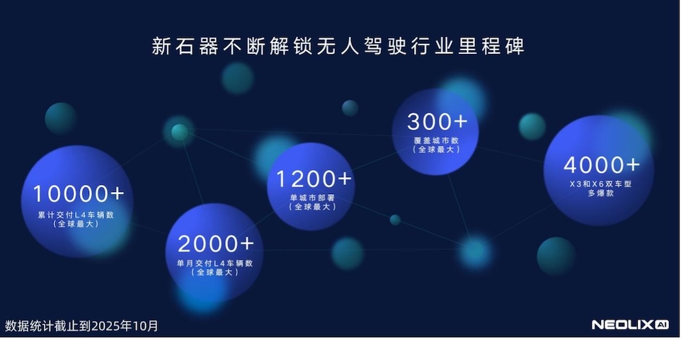 自2018年成立以来,新石器持续领跑RoboVan行业,并且近期实现了多个里程碑:累计交付L4自动驾驶车辆突破1万台车,成为全球第一家破万台的L4级车队;单月交付车辆突破2000台,成为全球首家单月突破2000台的自动驾驶公司;在青岛市部署车辆突破1200台,协助其成为全球无人驾驶车辆最多的城市;X3和X6车型累计交付数均突破4000台,成为行业中唯一实现多爆款(大规模交付SKU)批量交付的公司;部署车辆城市数突破300个,成为全球城市覆盖最多的自动驾驶公司;无人车累计L4自动驾驶里程已率先突破5000万公里,持续领先行业。