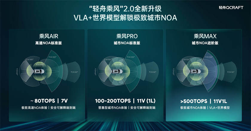 “轻舟乘风2.0”三级产品矩阵全面落地:乘风AIR:约80TOPS算力,7V配置,提供极致高速NOA体验;乘风PRO:约100-200TOPS算力,11V或11V1L配置,提供普惠型城市NOA体验;乘风MAX:超500TOPS算力,11V1L配置,深度融合VLA与世界模型,打造极致城市NOA体验。