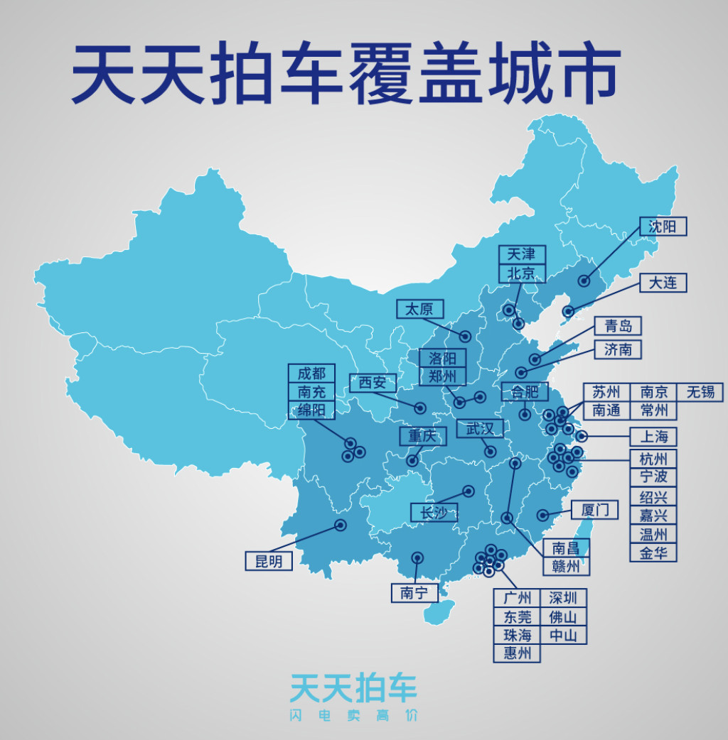 天天拍车表示,目前,天天拍车已在全国超过40个城市设立线下交易服务中心。天天拍车2016年最高月交易量已超过1万辆,2017年上半年交易量同比增长200%左右,接下来将进一步扩大服务范围,服务全国用户,预计到2020年,天天拍车年交易量将突破百万辆。