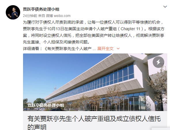 10月14日,贾跃亭主动申请个人破产重组及成立债权人信托的传闻得到官方确认。贾跃亭债务处理小组在发布的《有关贾跃亭先生个人破产重组及成立债权人信托的声明》(以下简称声明)中表示,贾跃亭已于美国当地时间10月13日根据美国相关法律第11章(chapter 11)主动申请个人破产重组,贾跃亭方表示这将是解决贾跃亭个人余下债务并保障债权人利益的最佳方案。