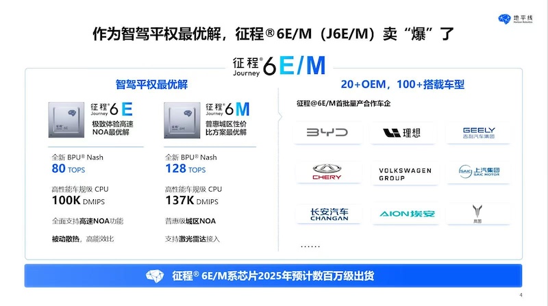 地平线征程6E/M计算方案在2025年即将达到百万级出货,征程家族累计出货量将突破1000万套。