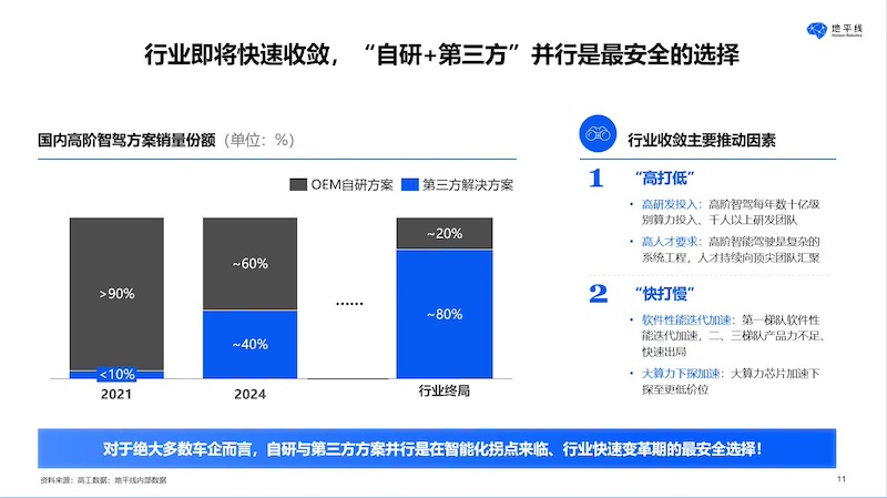 他认为,「自研+第三方」并行,是智能化拐点来临、行业快速变革期最安全选择。由于只有极少数车企在资金、人才、技术和数据具备「全栈自研」能力,开放合作将成为未来主流,「20%自研与80%合作将成为智驾赛道的稳态与终局。」