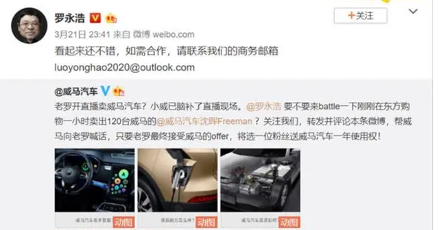 2020年3月,威马汽车新浪微博官方号主动@罗永浩,“ 要不要来battle一下刚刚在东方购物一小时卖出120台威马的@威马汽车沈晖Freeman?”