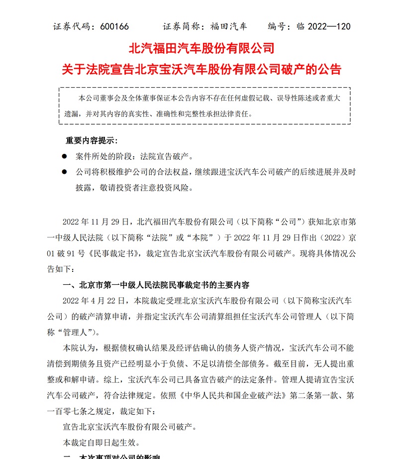 今天(11 月 30 日)北汽福田发布公告称,宝沃汽车已被裁定宣告破产。