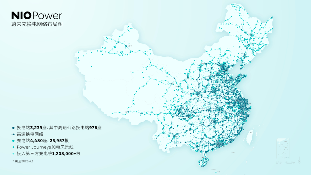在蔚来能源最新发布的数据中,截至4月1日,蔚来能源已在全国范围累计建设3,239座换电站,建成9纵9横14大城市群高速换电网络,布局近1,000座高速公路换电站,连通全国超700个城市,实现全国主要城市间高速换电网络建设。