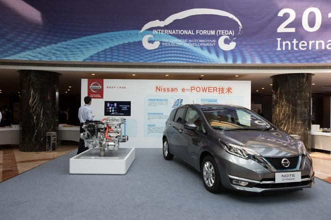 在论坛现场,日产展示了搭载全新电机动力传动系统的日产 e-POWER Note,该车型搭载的全新、高效的电机动力传动系统e-POWER被视为日产电气化战略中里程碑式的设计之一。