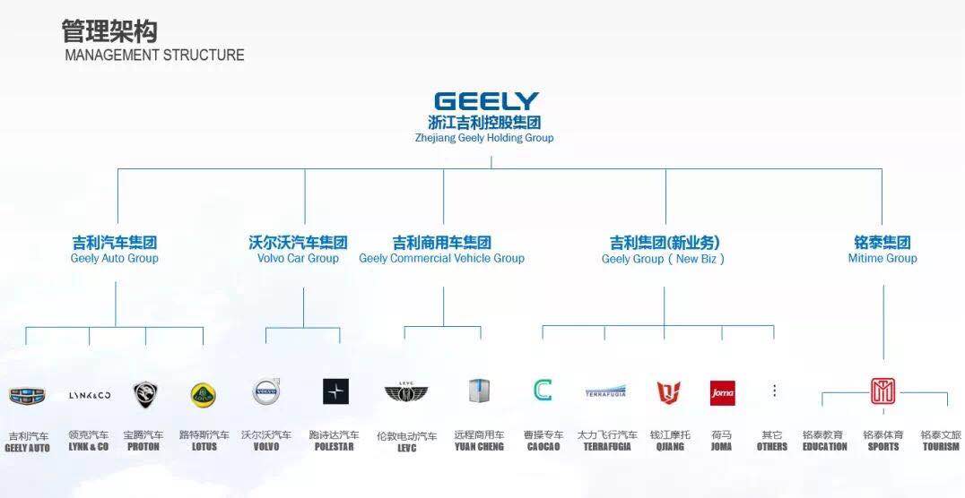 今天吉利控股集团已形成了吉利汽车集团、沃尔沃汽车集团、吉利商用车集团、吉利集团(新业务)和铭泰集团。