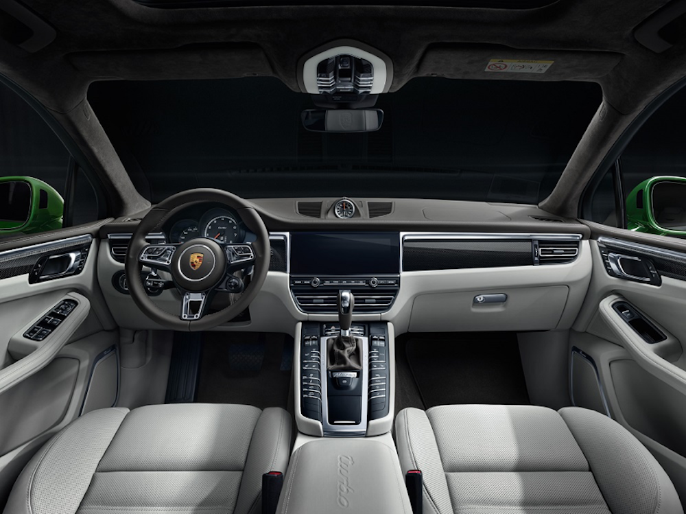 凭借独有的前裙板,三段式进气格栅以及标配的带保时捷动态照明系统(PDLS)的LED大灯,新款 Macan Turbo 进一步捍卫同级领先地位。新车标配了20英寸的 Macan Turbo 轮毂,Sport Design 侧裙板和车身同色的 Sport Design 外后视镜,令侧面造型卓尔不群。专门开发的固定式车顶扰流板采用双层设计,是 Turbo 车型的典型特征。标配的运动型排气系统可通过其双银色尾管轻松识别。新款 Macan Turbo 作为 Macan 车系中的旗舰车型,提供了更丰富的配置。标配全真皮包裹的自适应运动型座椅,并带有18向电动调节和记忆功能。Alcantara车顶内衬和拉丝铝内饰套件为车内更增添了高品质氛围。对于偏好运动感的车主,还可以选装常见于911车型的带加热功能的 GT 运动型方向盘。