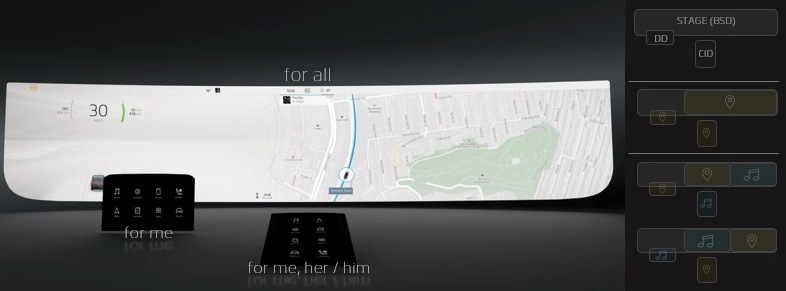 BYTON Stage全面屏拥有很大的观看视野,得益于前排旋转座椅,大屏上的内容可供全员观看。BYTON Stage全面屏分为左中右三个显示区域,左区显示车辆行驶相关的内容,中区与右区显示信息娱乐内容。中区与右区可以合并贯穿显示一个应用,供主副驾“全屏”观看,驾驶员与副驾驶都可以通过方向盘触控屏与副驾驶触控屏对显示的应用进行控制;中区与右区也可分别显示两个不同的应用,主副驾各有对应的操控区域,即驾驶员可以通过方向盘触控屏对中区的应用进行控制,而副驾驶可以通过副驾触控屏对右区的应用进行控制,不影响彼此。例如,主驾通过驾驶员触控屏操控显示在中区的导航,副驾通过副驾驶操控屏操控显示在右区的QQ音乐,两块屏各自对应,互不干扰。