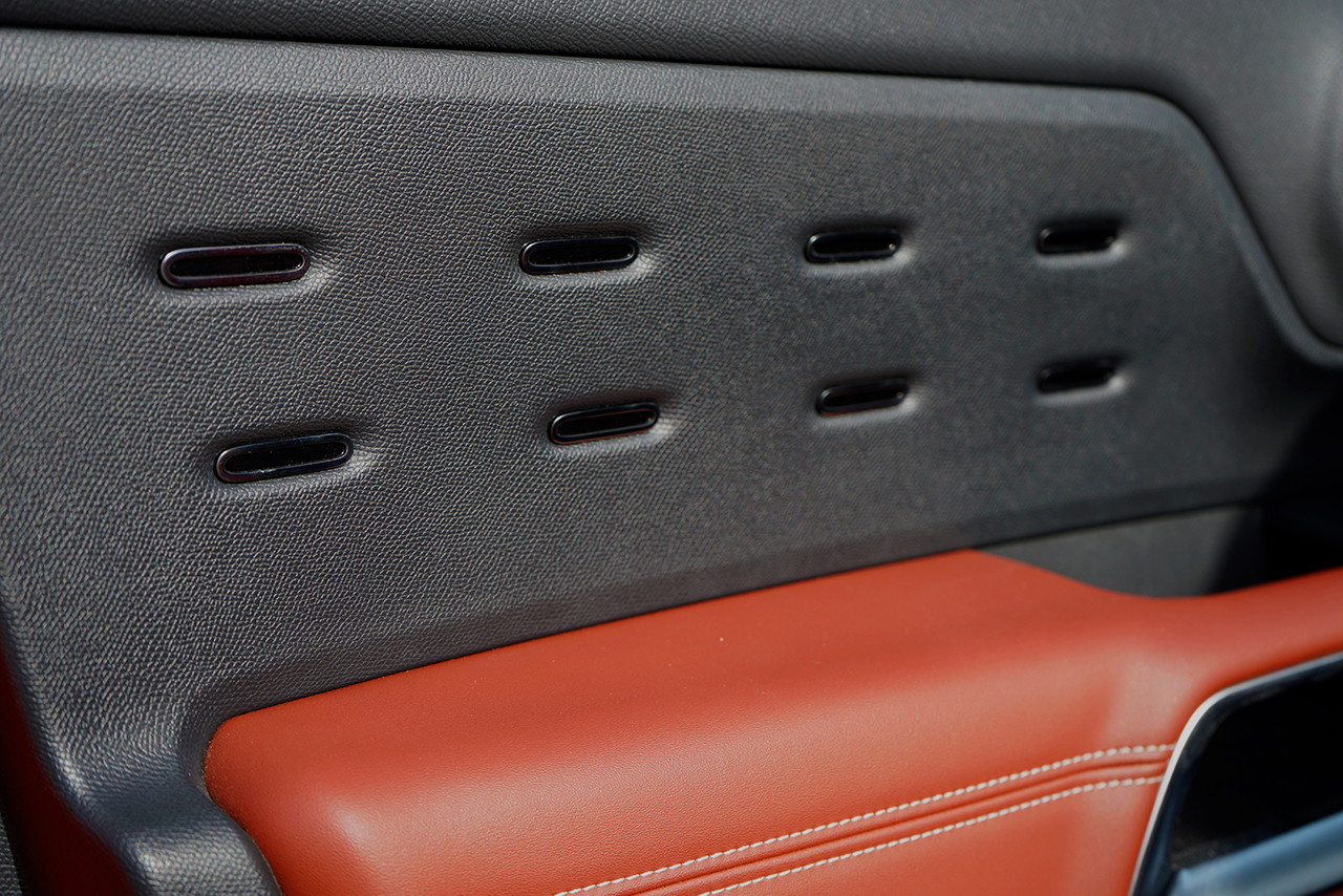 来到内饰,你会发现“口”字型的设计更多了,光是前排出风口就有8个,储物格和座椅中的纹路仍然是“口”字型,可以说是融会贯通。