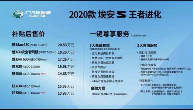2020款埃安S在取消魅Max 530及魅 Evo 530两款车型的基础上,推出全新NEDC续航达460km的魅580和炫580系列车型,实现续航进化;更全系升级标配升级了可开启式全景天窗、倒车影像、6扬声器、PM2.5滤芯和远程一键杀毒;同时,2020款埃安S还提供了三电终身质保服务(非营运首任车主,每年少于3万公里),使广汽新能源成为业内唯一所有产品均提供三电终身质保的车企。