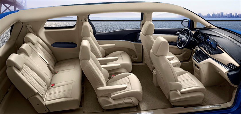 别克新GL8陆上公务舱的车内延续了悬浮风格内饰设计,12吋高清触摸屏兼顾豪华与科技感。新车在提供原有沉静灰、干邑棕的基础上,新增谦和米内饰色彩,营造更加温馨柔和的座舱氛围。前排座椅与第二排行政座椅升级通风与加热功能,配合触感极佳的头层小牛皮包覆与人体工程学设计,带来更加舒适惬意的乘坐体验。别克新GL8陆上公务舱三排均拥有宽绰的乘坐空间,且在七座使用状态时依然能够保证充裕的后备箱空间,放倒第三排座椅后可扩展至1605升,为商务或家庭出行等多用途使用场景提供更多可能。