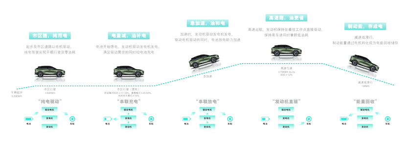 猛踩油门时,发动机发电,电池放电,共同让提速响应更快;高速行驶时,切换到发动机直驱模式,发挥高速低油耗优势;制动时,启动动能回收机制为电池蓄电。