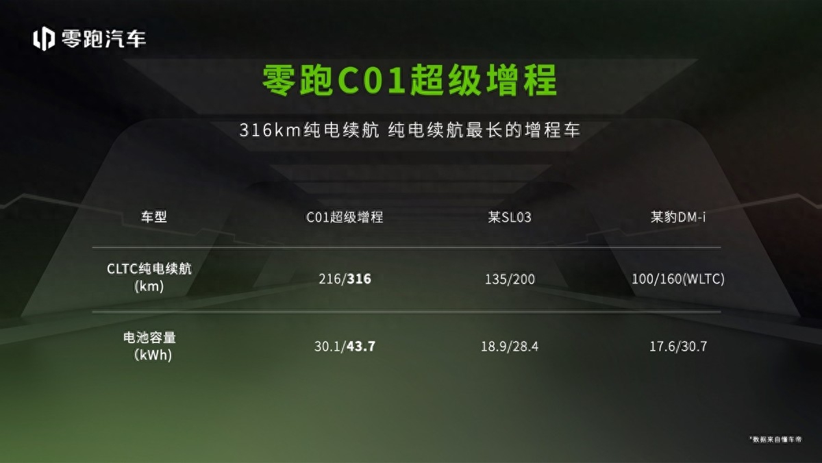 零跑C01超级增程搭载容量最大为43.7kWh自研贯穿式大模组电池包,CLTC纯电续航里程达到了316公里。对于此次推出这么长的纯电续航版本车型,零跑汽车方面介绍,这是对用户做了深入调研后得出的结果。