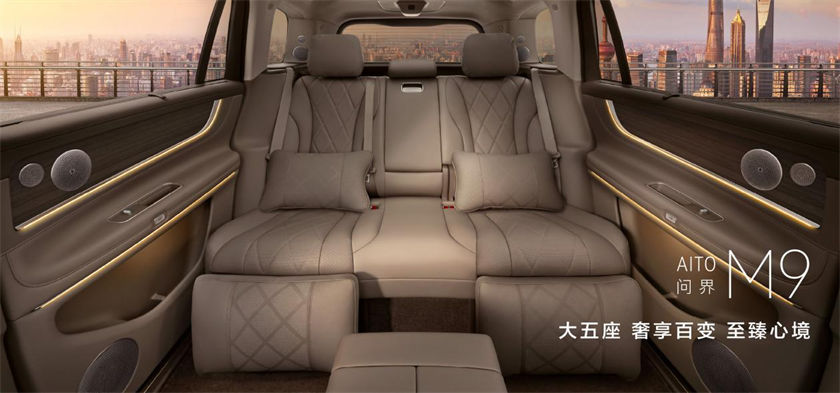 问界M9大五座车内总乘用空间达到3500mm,二排腿部空间可拓展至1985mm,奢阔空间超越同级。问界M9大五座内饰精致不凡,绗缝工艺,采用优质Nappa真皮、天然实木等上乘材质,全系标配舒云座椅,具备座椅加热、通风、按摩功能,二排座椅配备可四向电动调节双腿托,最大调节角度达75°,座椅靠背最大调节角度达43°。