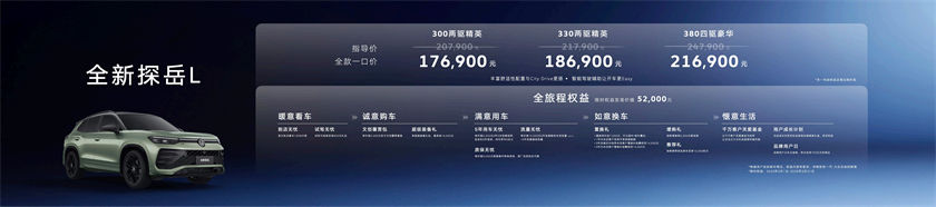 新车共推出300TSI、330TSI、380TSI三种动力配置共3种车型,官方指导价20.79万元起,可选装舒适性配置丰富的City包和驾驶辅助功能Easy包。现在购买全新探岳L,还将享受17.69万元起的全款一口价。