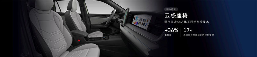 舒适体验上,全新探岳L 配备了专为中国用户研发的云感座椅,座椅柔软度提升了36%,坐上去可以完全放松。除柔软外,云感座椅还拥有Audi A8 同款人体工学座椅设计,提供身体从靠背到大腿共17 处不同部位的差异化定制支撑,即使长途驾驶也不感疲惫,让更多用户体验到越级的舒适。