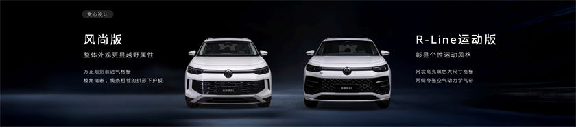 外观造型上,为满足当下用户多元化的审美需求,全新探岳L 提供两种前脸设计。其中,风尚版车型的前脸方正且规则的进气格栅,辅以棱角清晰、线条粗壮的拱形下护板,整体外观更显越野属性。相比之下,R-Line运动版则采用了品牌标志性的网状、高亮黑、大尺寸格栅,与两侧夸张的空气动力学气帘相得益彰,赋予车辆更凌厉气质,充分彰显个性运动风格。