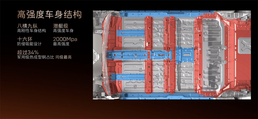 电池安全方面,电芯采用宁德时代AI 加强的第八代智能产线,累计通过150+项专项安全和性能试验,电池0起火0爆炸,达到了极高安全标准。此外,门槛梁采用全贯穿式六宫格铝型材和热成型钢三层外中内板组合设计,形成“三明治”式防护结构,外加热成型双拼座椅后横梁结构,组成三重防护结构,在遭遇冲击时高效保护电池。