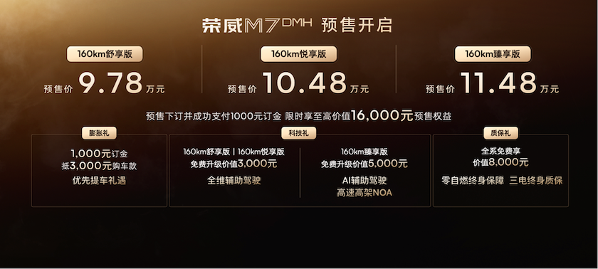 荣威M7 DMH已于成都车展开启预售,预售价9.78万元起,一周内订单已破万。这款长续航中大型豪华轿车将于9月17日正式上市,届时更多购车权益与配置细节全面公布,将以越级实力定义10万级混动家轿新标准。