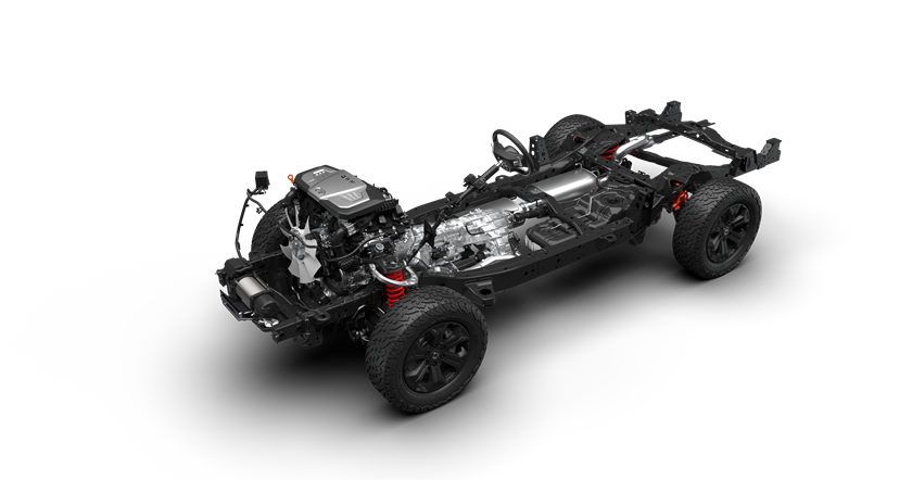原厂即升高2英寸,配备33°接近角、22°离去角、26°纵向通过角,最小离地间隙达240mm,使其具备全地形征服能力。