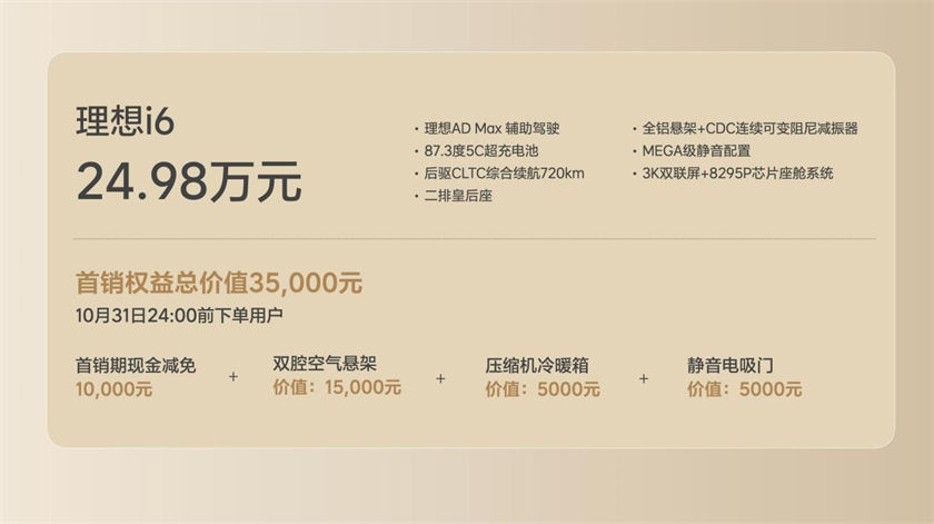 9月26日,理想i6正式上市,新车仅一款配置售价24.98万元,与理想L6的起售价相同。