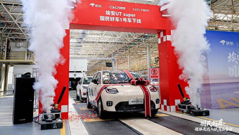 11月5日上午,伴随一台全新车型缓缓驶出广汽埃安长沙智能生态工厂生产线,标志着由零售、制造与能源三大领域的代表企业京东、广汽集团、宁德时代联合推出的“国民好车”——埃安UT super 1号车正式迎来下线。这也是该款新车首次对外完整展示外观设计、制造工艺、电池技术及换电过程等细节。