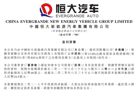 深夜盈利预警!恒大汽车上半年预亏约48亿元,因新能源汽车处于投入阶段