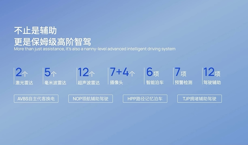 值得一提的是,睿蓝7还将搭载2颗激光雷达、5个毫米波雷达、12个超声波雷达和11个摄像头,提供L3及以上高阶智能驾驶辅助能力,包括6项智能泊车、7项预警检测、12项驾驶辅助功能,并将支持AVBS自主代客换电。