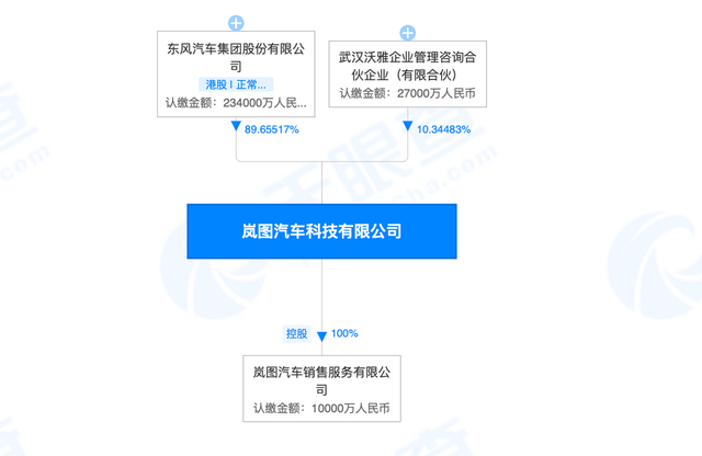 2020年,东风小康股份向东风定向增发约3.27亿股股票之后,东风小康彻底成为小康股份全资子公司,东风旗下的新能源使命的重担,全都压在了岚图身上。天眼查APP信息显示,东风集团持股岚图89%。