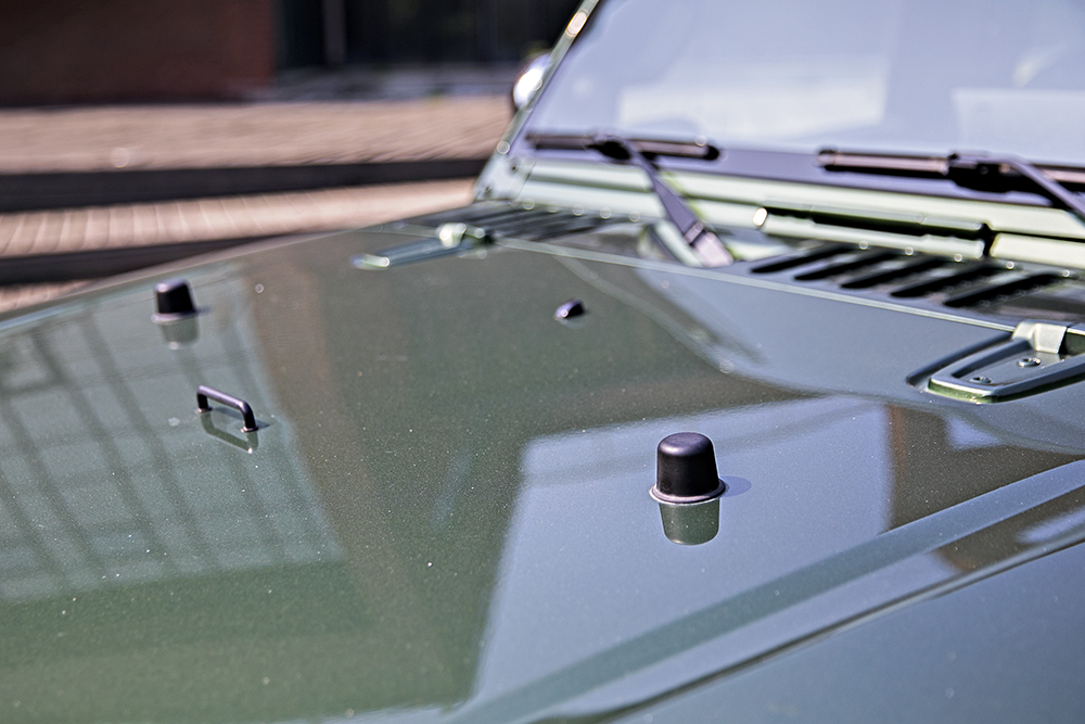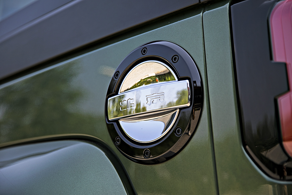 北京BJ40 城市猎人版依然延续了外露铆钉、铰链结构和门把手这些粗犷的设计,当然在极端条件下,车顶、车门甚至前风挡都是可以拆卸的。侧面我最喜欢的地方是油箱盖,装饰的很精细。