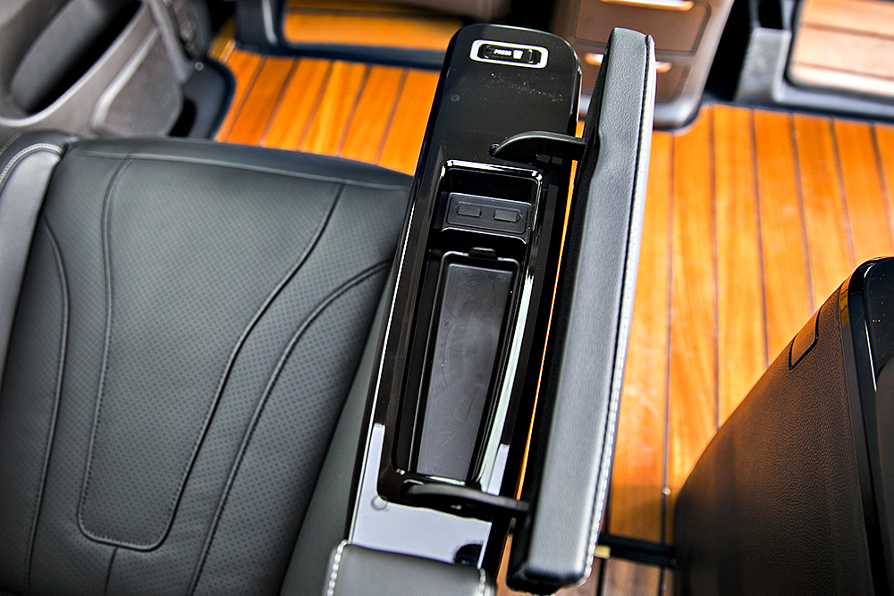 第二排还配有独立的空调控制区域,操作也是按键+滑轮,底部还有USB充电接口、12V/220V电源接口,方便为各种电子设备充电。