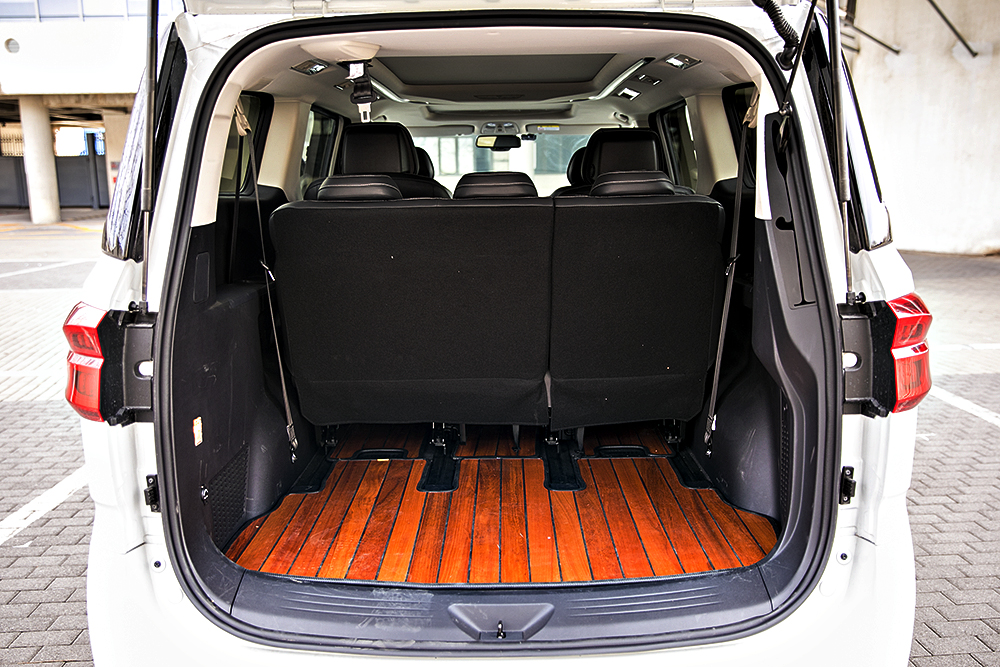 行李厢尾门支持电动和感应两种开启方式,因为第三排座椅支持前后小范围滑动,所以行李厢的储物空间会更灵活,而且第三排座椅支持4/6放倒会进一步提升储物能力,但是第三排座椅并不能向前翻折,所以要装载一些体积偏大偏长的物品会有影响,一般中号拉杆厢放3-4个没问题(第三排座椅打开情况)。
