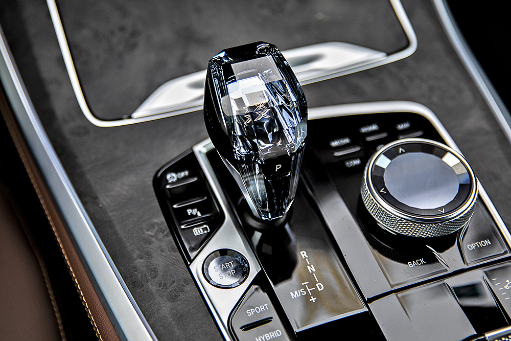 来到车内可以看到依然是非常豪华的内饰氛围,除了在屏幕中出现了一些蓝色底色之外,几乎察觉不到任何与燃油版车型不同的地方,中控台皮革包覆、木纹装饰仍是典型的宝马风格。