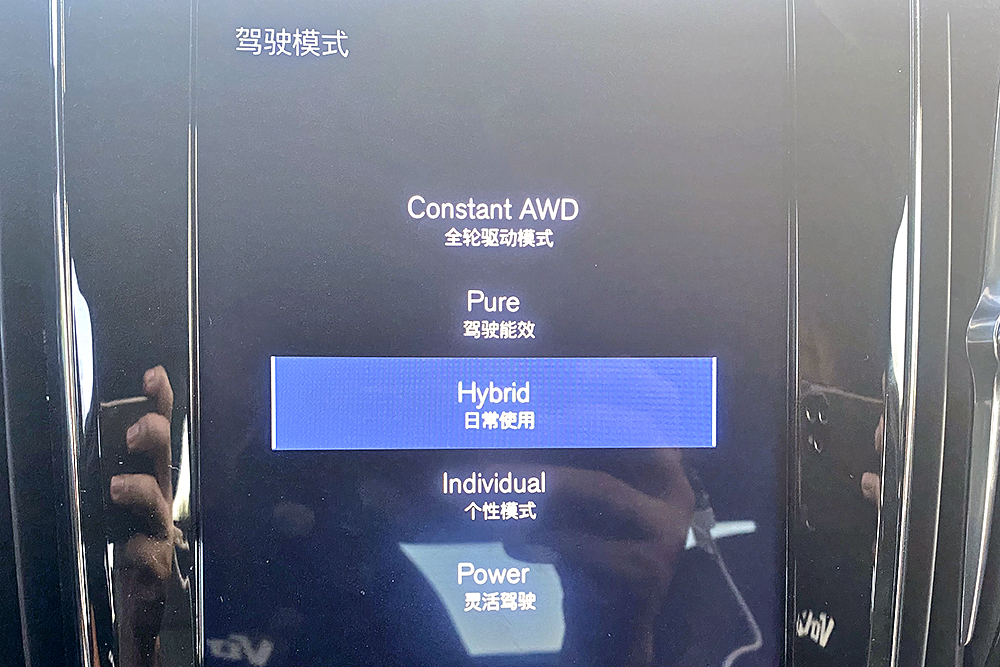 T8版本驾驶模式分为:全轮驱动(Constant AWD)、驾驶能效(Pure)、日常使用(Hybrid)、灵活驾驶(Power)以及自定义模式(Individual),五种。