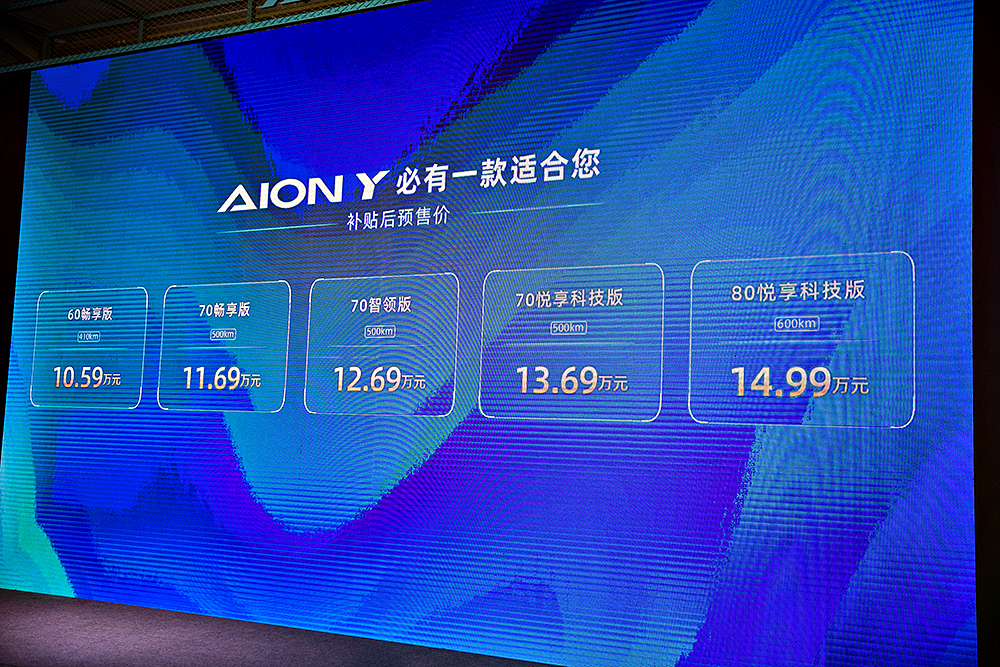 总结:2021年3月29日,广汽埃安AION Y在杭州开启预售,共有畅享版、智领版以及悦享科技版5款车型,覆盖410km、500km、600km三种续航里程,补贴后预售价格为10.59万元-14.99万元。另外,在3月29日起,AION Y开通广汽埃安APP线上预订通道,通过线上预订成功的客户,不仅可享受首任车主三电质保终身免费(非营运、行驶里程≤3万公里/年)、车联网服务终身免费(6G/月)、道路救援终身免费等“用车无忧”尊享权益,更可通过“尊贵定”套餐享受保养服务终身免费。