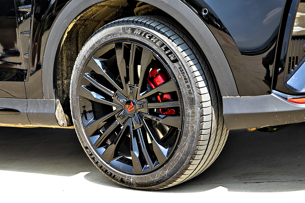 轮辋样式比较复杂且有蓝色元素点缀,轮胎层面使用米其林浩悦4系列,尺寸为:235/45 R19英寸,此款轮胎主打排水和舒适性。“黑武士”版本全黑色轮辋搭配红色制动卡钳,运动气息更加浓郁。