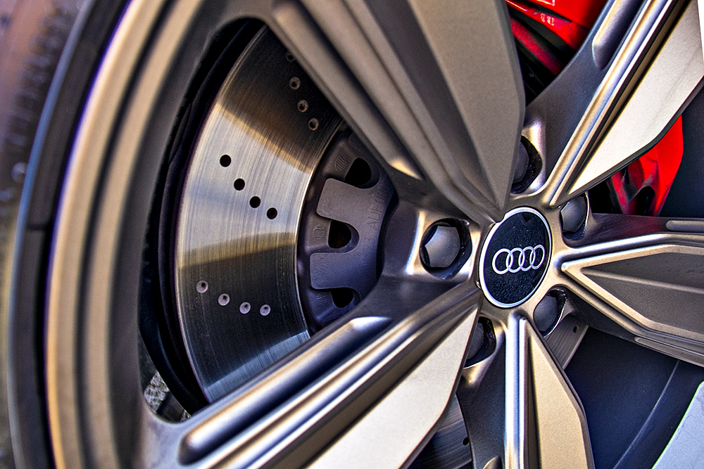 中期改款RS 5全系标配19英寸轮毂,制动系统:前六活塞卡钳+375mm刹车盘,后单活塞+330mm刹车盘;用户可以选装20英寸轮辋以及前轮直径400mm的碳陶刹车盘(本车样式)。刹车盘颜色还可以选择蓝色、红色或灰色。