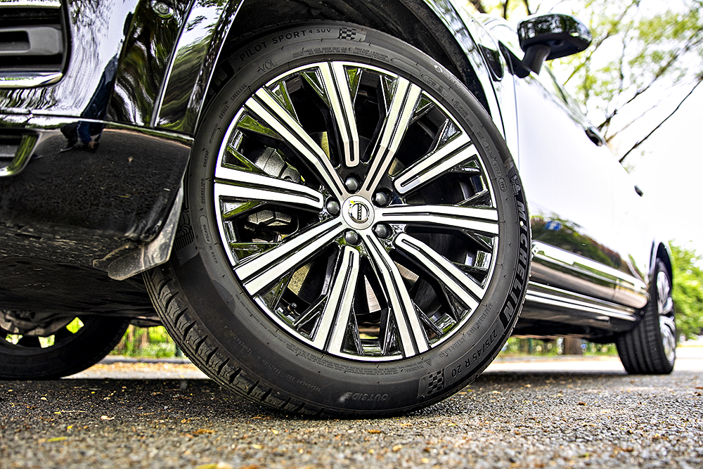 多条幅铝合金轮辋很漂亮,这也是豪华版的套装的标配样式,轮胎选用米其林品牌,尺寸为:275/45 R20英寸。有一双“大脚”加持,更让侧面看上去气势十足。