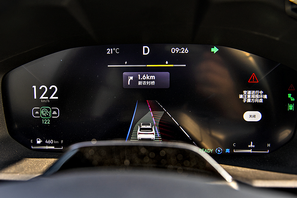 得益于电机以及非常出色的发动机数据,在初上手的第一感觉是整台车驾驶非常轻松且安逸,尤其是低速行驶的时候,因为电机驱动,油门响应非常之灵敏,而当速度提升之后,发动机介入柔和,途中加速也不会出现疲软限行。
