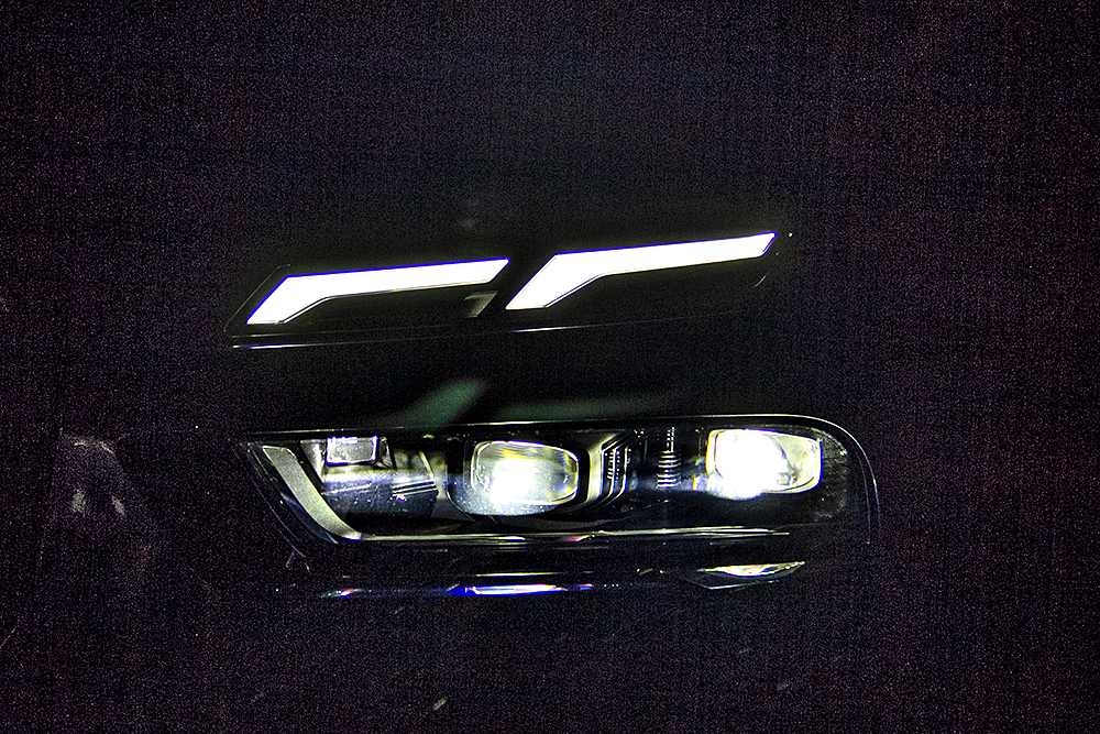 分体式大灯的出现可谓让很多人吃惊,上部为日行灯和转向灯,远近光灯组在下方,并使用熏黑处理,与前保险杠融为一体,营造出了更为深邃的眼眸。