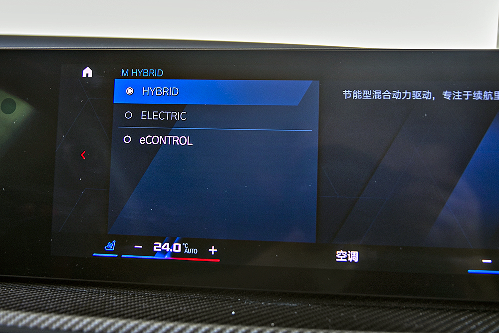 “M HYBRID”按键是XM独有的,在这里有“HYBRID”、“ELECTRIC”以及“eCONTROL”三种驱动模式,其实都不难理解,前两者为常规的混合动力驱动与纯电力驱动,后者更是支持最高140km/h的车速。
