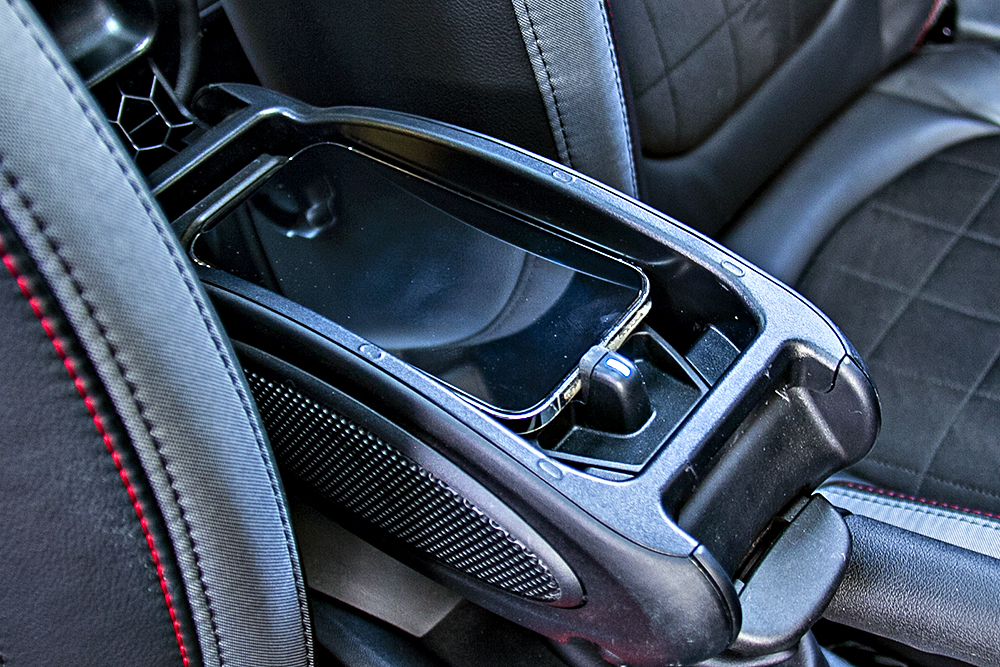 前排扶手箱内部配有一个无线充电面板,但是因为扶手箱尺寸的原因,所以这个充电面板对于手机尺寸有比较高的要求。
